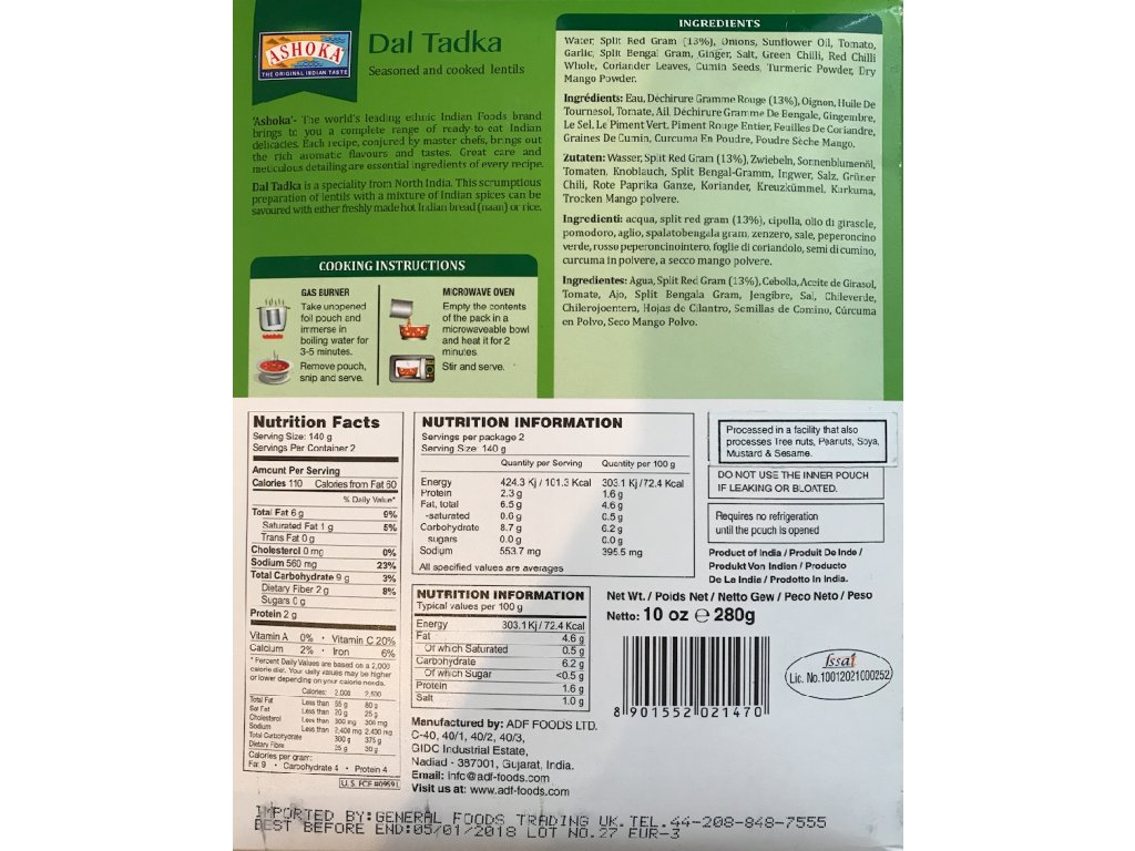 Összetevők: víz, lencse, hagyma, napraforgóolaj, paradicsom, fokhagyma, gyömbér, só, chili, korianderlevél, köménymag, kurkuma.
