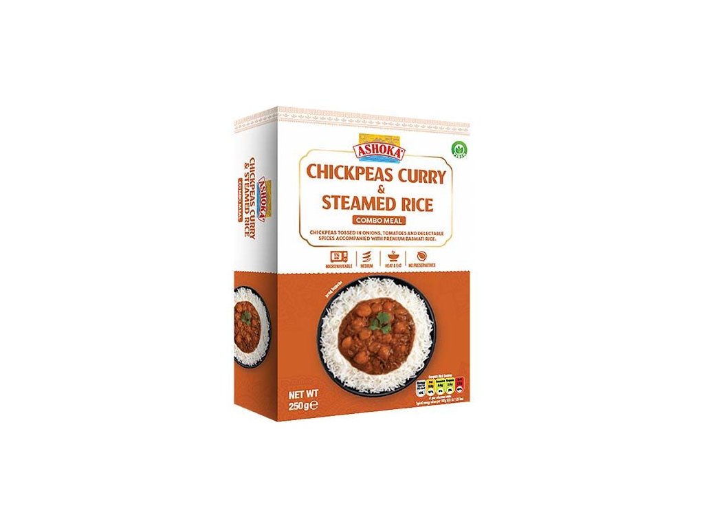 Az ASHOKA Instant Chickpeas Curry & Steamed Rice egy ízletes kész indiai étel, amely pikáns csicseriborsó curry-t (choley) és puha, párolt basmati rizst egyesít egy csomagban. Az étel gyorsan elkészíthető melegítéssel, így ideális gyors ebédhez vagy vacsorához